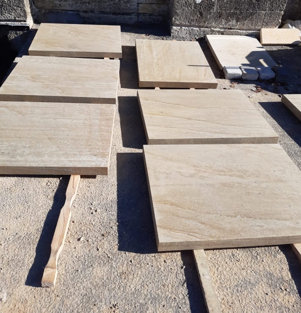 Newly sawn Buff Yorkstone paving. Tightly packed and veined with a blend of quartz and sandstone. 50mm thick x 600mm wide. Order on line (Cut to 50 or 63mm thickness x 600mm wide) Sold by the m2. Present lead times are around 6 – 8 weeks from date of order although some stock will always be available. Now available to order on line .